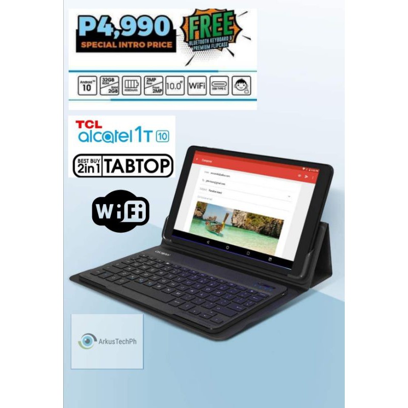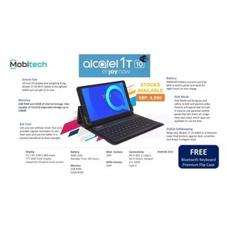 Alcatel 1t 10 android tablet. It is a php 4 990 tablet that comes with a free bt keyboard and flip case. Tcl alcatel 1t10 was also recently launched in the philippines. Google assistant to manage tasks and google photos to enjoy family memories.