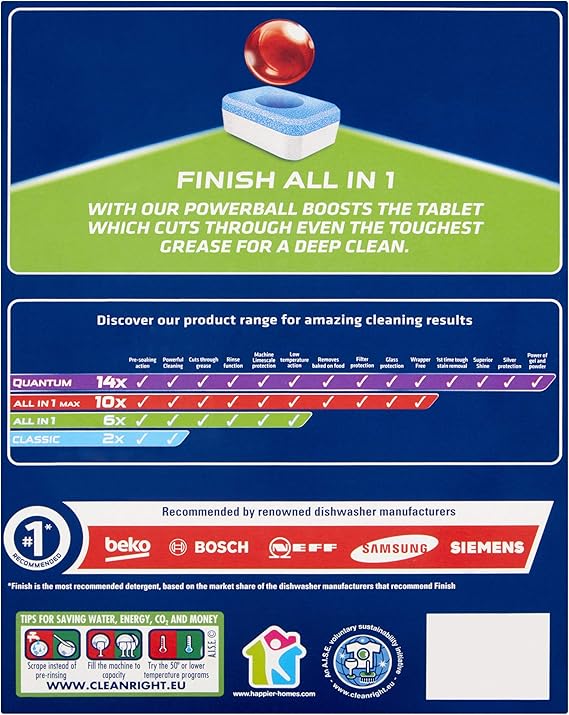 Finish dishwasher detergent max in 1 powerball super charged power and free 50 tablets less harsh chemicals. Quantity of finish powerball quantum ultimate 50 tablets in trolley 0. Explore the products finish has to offer to learn how you can achieve amazing shiny results with every cycle. When washing up with a dishwasher finish dishwashing tablets deliver powerful dish and glass cleaning in the toughest conditions.