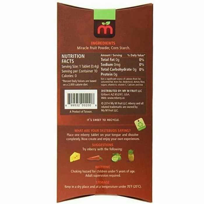 Each mberry tablet envelope comes with pairing suggestions so you can step into the shoes of a food critic. The mberry has become the leading brand for the miracle berry market and its competition seeks to ride on its popularity. Turn sour food sweet by inhibiting your taste receptors. Sold last 24 hours.