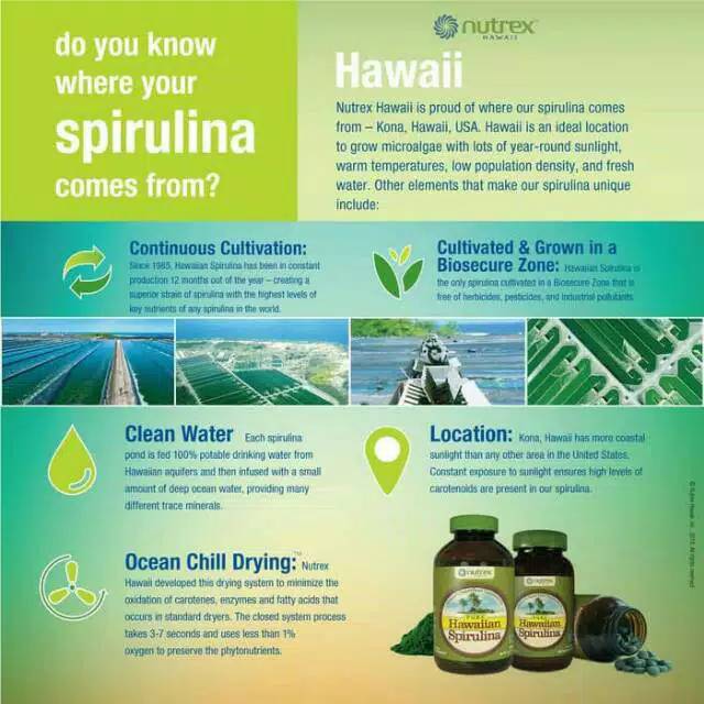 Hawaiian spirulina contains more nutrition per gram than any other spirulina on the market it is free of pesticides herbicides gmos lactose soy and solvents it is 100 vegetarian 100 vegan and is all natural hawaiian spirulina pacifica is the only spirulina grown with deep sea water providing essential trace minerals and. Hawaiian spirulina is the only spirulina cultivated in a biosecure zone free of pesticides herbicides and industrial pollutants in kona hawaii the sunniest coast in the united states. Nutrex hawaii pure hawaiian spirulina pacifica 1000 mg 180 vegan tablets 34 90 77 56 1 kg in stock.