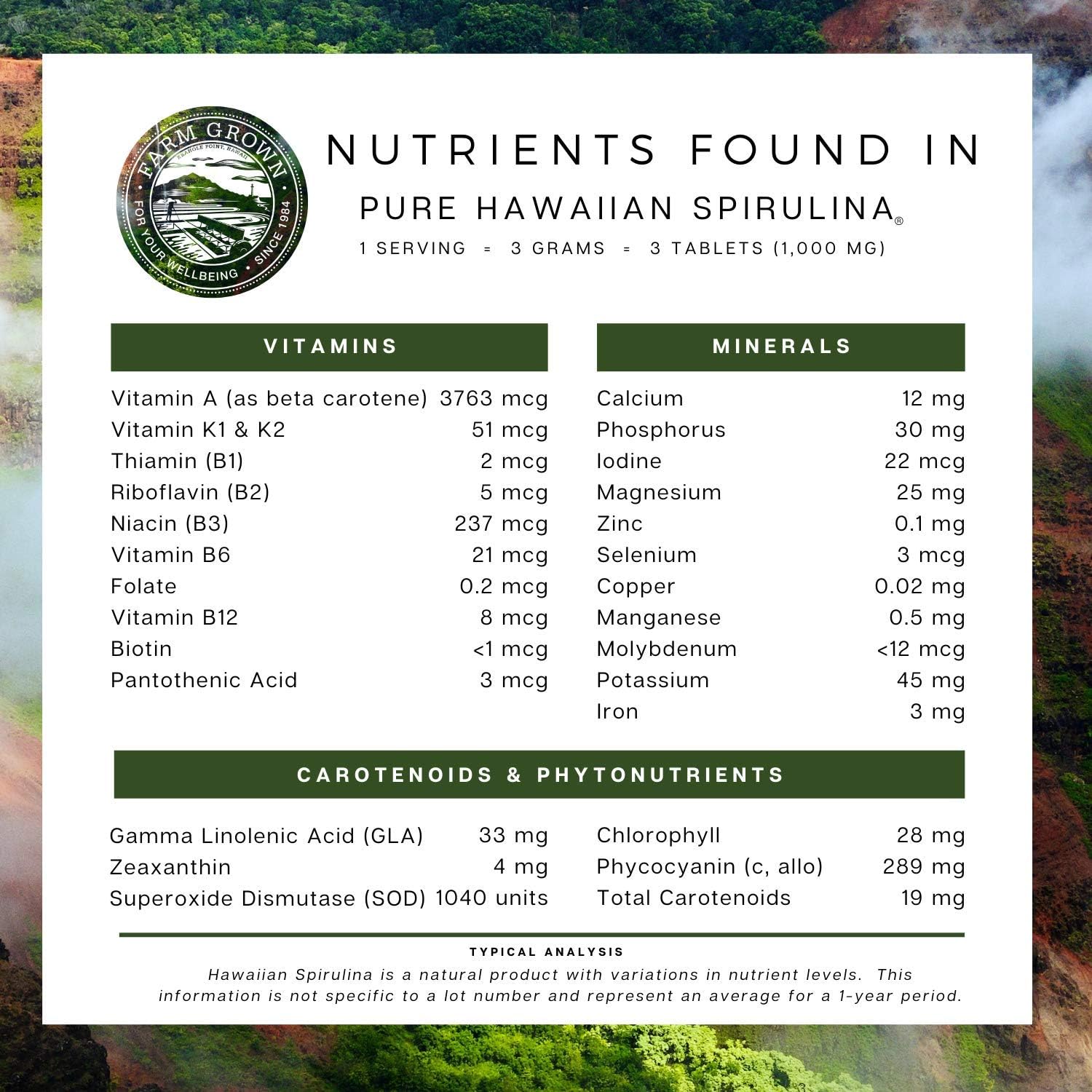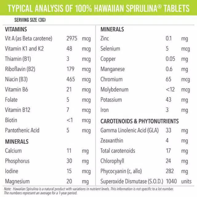 6 x 500 mg tablets or 3 x 1000 mg tablets daily powder. Spirulina is an organic. Sold by naturprodukte shop and sent from amazon fulfillment. Hawaiian spirulina is the only spirulina cultivated in a biosecure zone certified free of pesticides herbicides and industrial pollutants in kona hawaii the sunniest coast in the usa.
