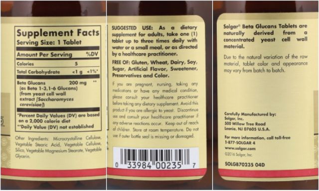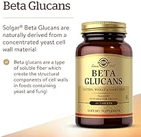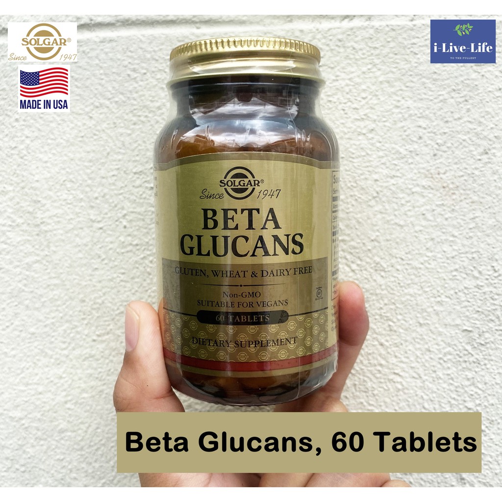 Solgar beta glucans 60 tablet. Beta glucans tablets one of solgar s premium quality products is naturally derived from concentrated yeast cell wall material. In addition to the beta 1 3 glucans the natural yeast cell wall concentrate contains beta 1 6 glucans. Beta glucans are a type of soluble fibre or naturally occurring sugars which create the structural components of cell walls in foods containing yeast and fungi. As a dietary supplement for adults take one 1 tablet up to three times daily with water or a small meal or as directed by a healthcare practitioner.
