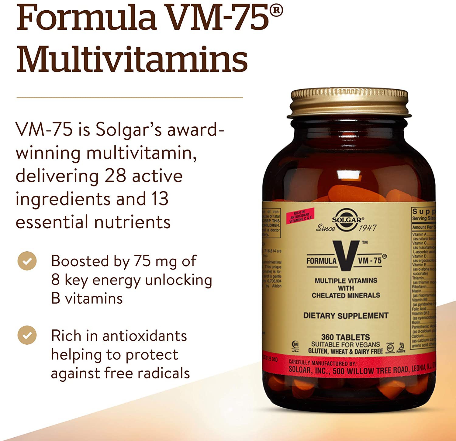 Solgar formula vm 75 is a high potency multivitamin with amino acid chelated minerals. Formula vm 75 60 tablets by solgar at the vitamin shoppe. Vm 75 is our flagship award winning multivitamin tablet delivering 28 active ingredients and 13 essential nutrients. Keep out of the reach of children.