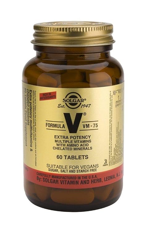 Solgar formula vm 75 60 tablet. 60 tablets suitable for vegetarians. Boosted by 75 mg of 8 key energy unlocking b vitamins rich in antioxidants helping to protect against free radicals includes immune supportive vitamin c premium forms of ingredients vegan vegetarian kosher halal description vm 75 is our flagship award winning multivitamin formula delivering 28 active ingredients and 13 essential nutrients. Formula vm 75 60 tabletsuggested use as a dietary supplement adults take one 1 tablet daily preferably with a meal or as directed by your healthcare professional supplement factsserving size 1 tablet servings per container 60 amount per serving daily value vitamin a as natural beta carotene 7 500 iu 150 vitamin c as niacinamide ascorbate l ascorbic acid 250 mg 417 vitamin d as. Solgar formula vm 75 60 tablets visit the solgar store.