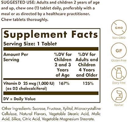 Solgar vitamin d3 1000 iu 100 tablet. Solgar vitamin d3 1000iu tablets are sugar salt and starch free these are also suitable for vegetarians. Vitamin d3 1000 iu 25 mcg chewable tablets with its 1 a day dosage contributes to. This is one of solgar s range of d3 formulations available in variable doses and forms. Solgar s kof k certification k 1250.