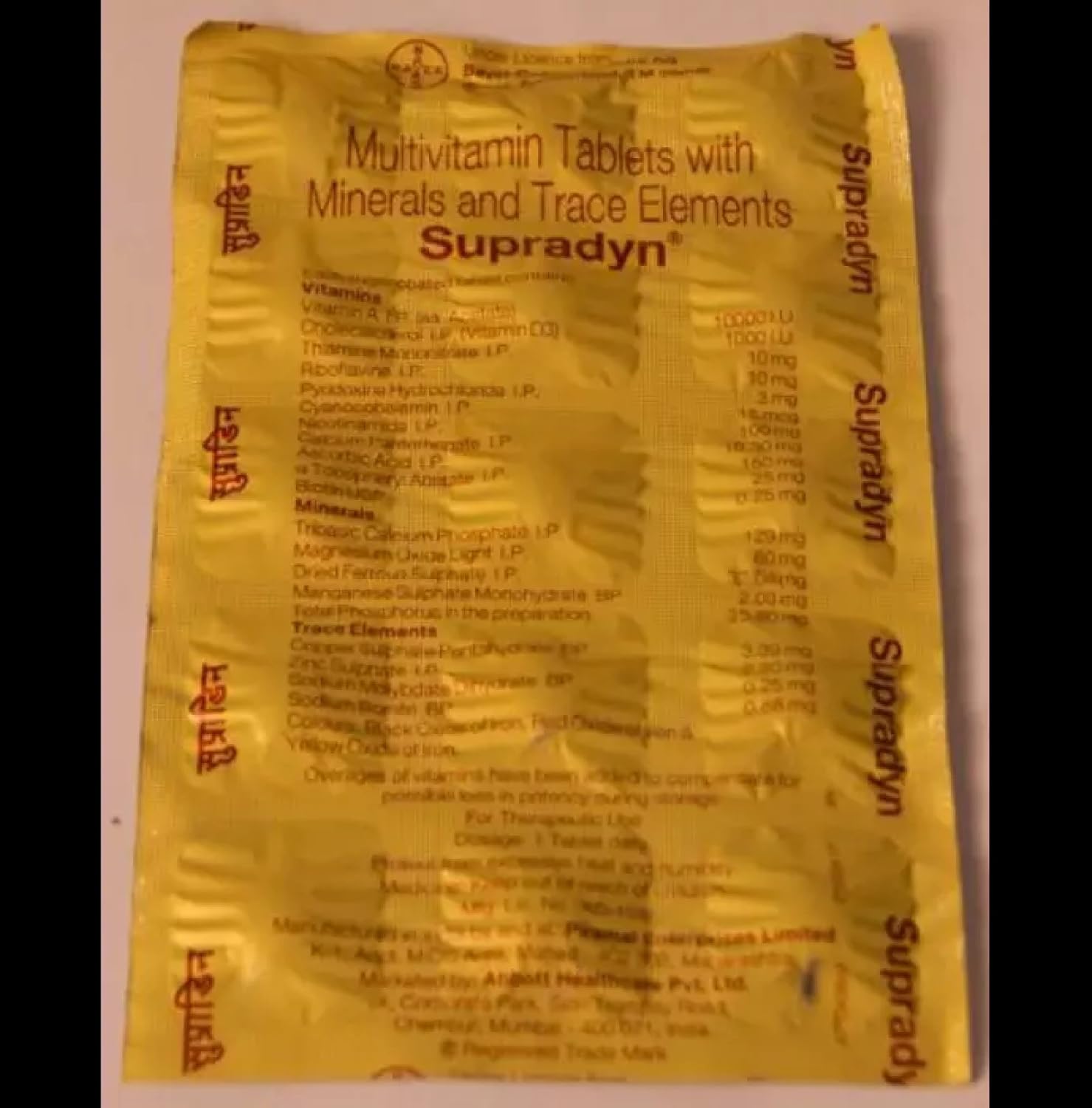 Supradyn vitamin tablet. Also to this is multi mineral vitamin medicine help in improvement of the immunity. It helps compensate for the absence of minerals and vitamins which are not present in the food items being consumed. Primarily used for building improving overall body immunity and fighting fatigue the tablet has the below list of benefits. Nutrient label claim nrv vitamin a 1 1 mg 137 vitamin d 0 005 mg 33 vitamin e 10 0 mg 67 vitamin c 180 0 mg 180 vitamin b 1 4 5 mg 375 vitamin b 2 5 1 mg 392 nicotinamide 21 0 mg 131 vitamin b 6 6 0 mg 353 folic acid 0 2 mg 50 vitamin b 12 0 006 mg 250.