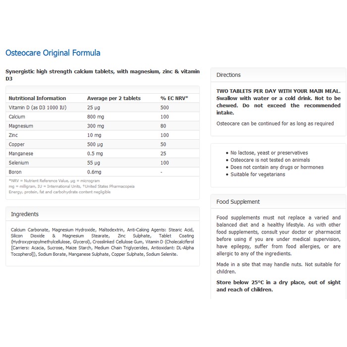 Plus get the lowest price from the last 90 days and free delivery. Osteocare tablets two tablets daily or one tablet twice daily is recommended before or with meals with water or a cold drink. The liquid version is ideal for those who have difficulty swallowing tablets and for younger children and infants over six months of age. Buy vitabiotics osteocare original 90 tablets and collect 4 advantage card points when you spend 1.