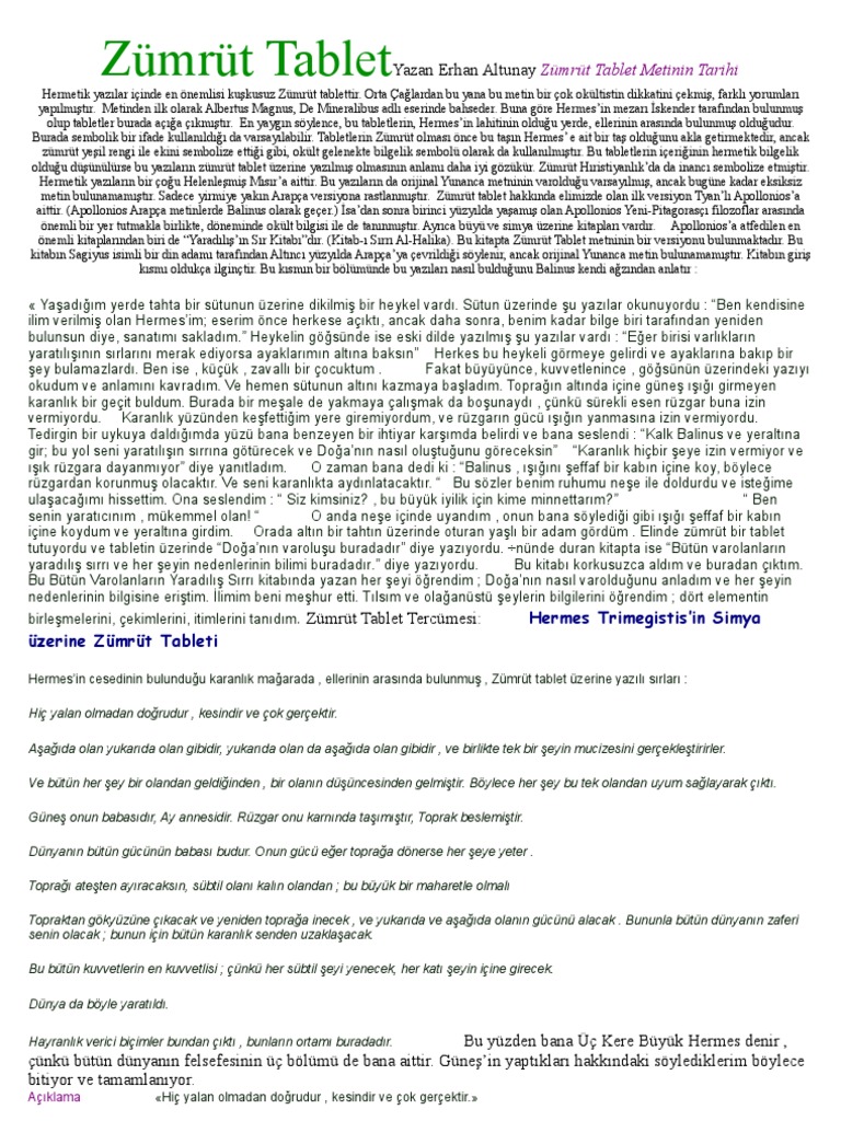 Tablet zümrüt food industry and trading corporation. Holmyard davis ve anon bu tablet in hayatta kaldığımız tüm simya eserlerinin en eskilerinden biri olabileceğini düşünüyor. Zümrüt tablet hakkında elimizde olan ilk versiyon tyan lı apollonios a aittir. Yazılı ilk kaydına 800 yılında abdulkadir geylani nin kitab ı sirr al asrar sırların sırrı kitabında rastlanmaktadır.