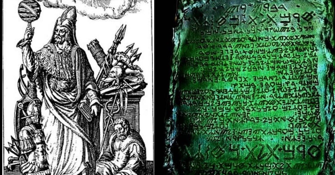 Zümrüt tablet yazarının yunan tanrısı hermes ve antik mısır tanrısı thoth un karışımı olan efsanevi helenistik hermes trismegistus üç kere büyük hermes olduğunu söyler.